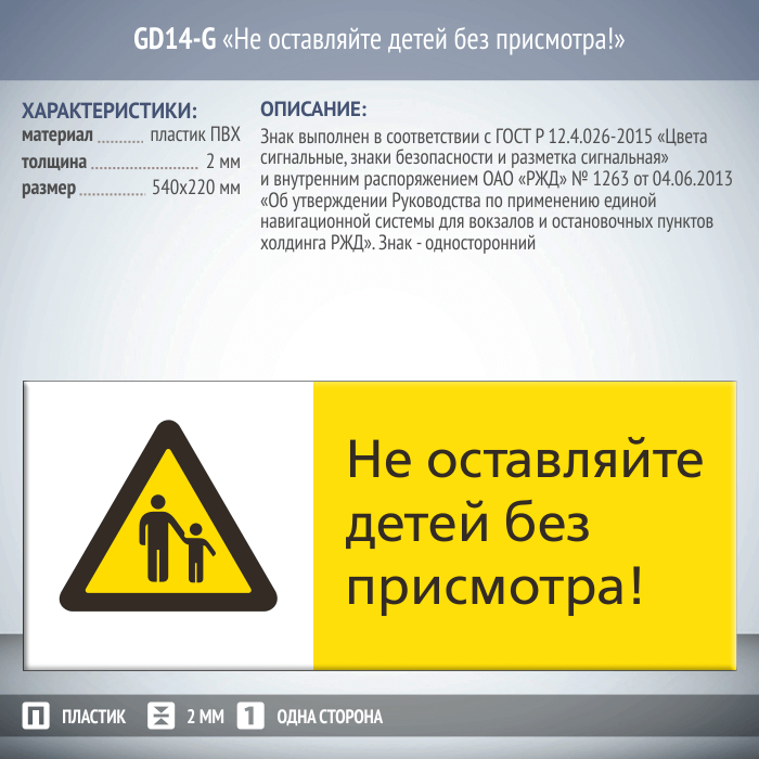 Знак «Не оставляйте детей без присмотра!», GD14-G (односторонний горизонтальный, 540х220 мм, пластик 2 мм) в Черкесске купить