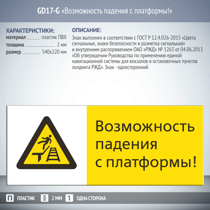 Знак «Возможность падения с платформы!», GD17-G (односторонний горизонтальный, 540х220 мм, пластик 2 мм) в Черкесске купить
