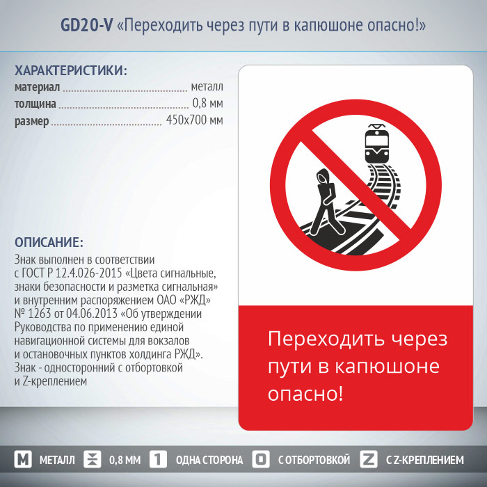 Знак «Переходить через пути в капюшоне опасно!», GD20-V (односторонний вертикальный, 450х700 мм, металл, с отбортовкой и Z-креплением) в Черкесске купить