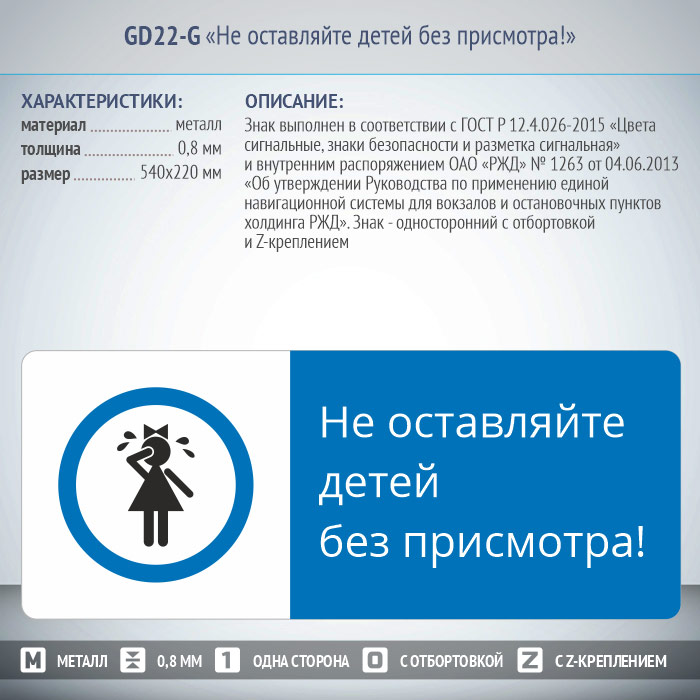Знак «Не оставляйте детей без присмотра!», GD22-G (односторонний горизонтальный, 540х220 мм, металл, с отбортовкой и Z-креплением) в Черкесске купить