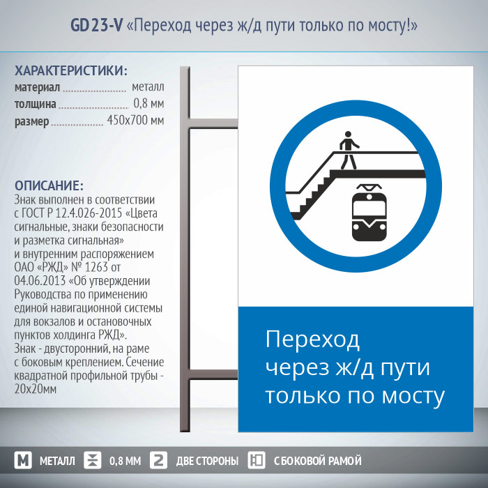 Знак «Переход через ж/д пути только по мосту!», GD23-V (двусторонний вертикальный, 450х700 мм, металл, на раме с боковым креплением) в Черкесске купить