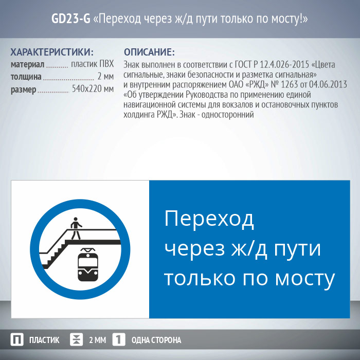 Знак «Переход через ж/д пути только по мосту!», GD23-G (односторонний горизонтальный, 540х220 мм, пластик 2 мм) в Черкесске купить