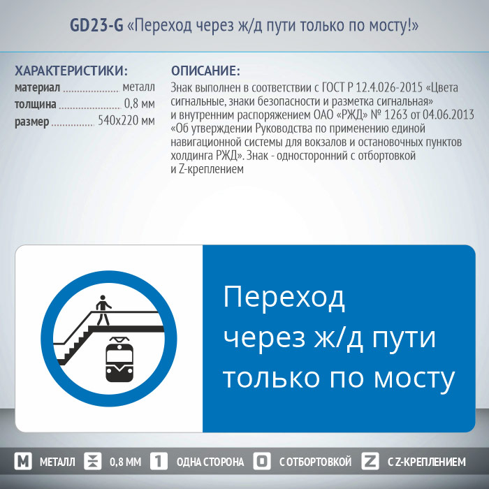 Знак «Переход через ж/д пути только по мосту!», GD23-G (односторонний горизонтальный, 540х220 мм, металл, с отбортовкой и Z-креплением) в Черкесске купить