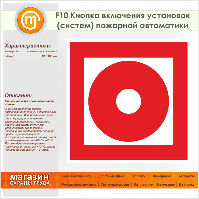 Знак F10 «Кнопка включения установок (систем) пожарной автоматики» (пленка, 100х100 мм) в Черкесске купить