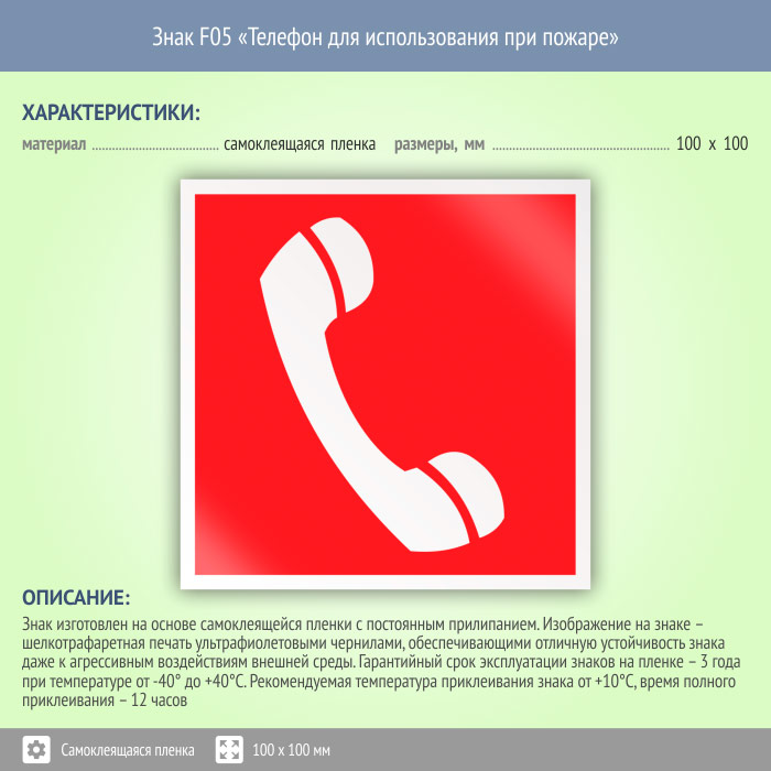 Знак F05 «Телефон для использования при пожаре (в том числе телефон прямой связи с пожарной охраной)» (пленка, 100х100 мм) в Черкесске купить