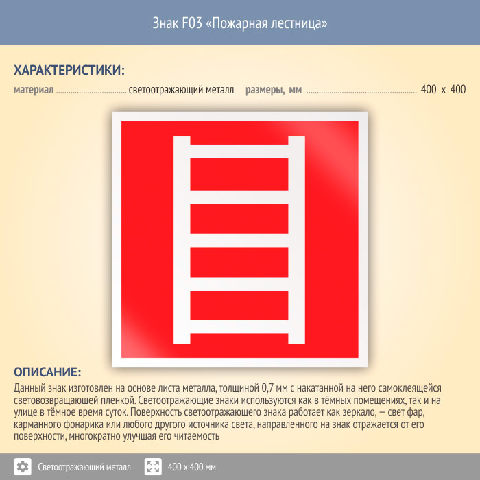 Знак F03 «Пожарная лестница» (светоотражающий металл, 400х400 мм) в Черкесске купить