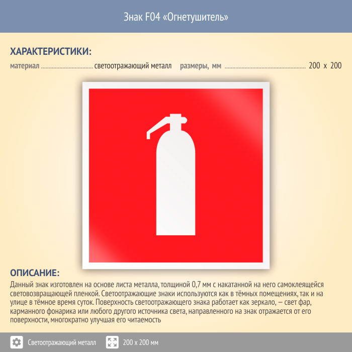 Знак F04 «Огнетушитель» (светоотражающий металл, 200х200 мм) в Черкесске купить