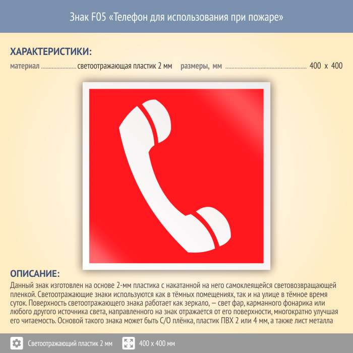 Знак F05 «Телефон для использования при пожаре (в том числе телефон прямой связи с пожарной охраной)» (светоотражающий пластик, 400х400 мм) в Черкесске купить