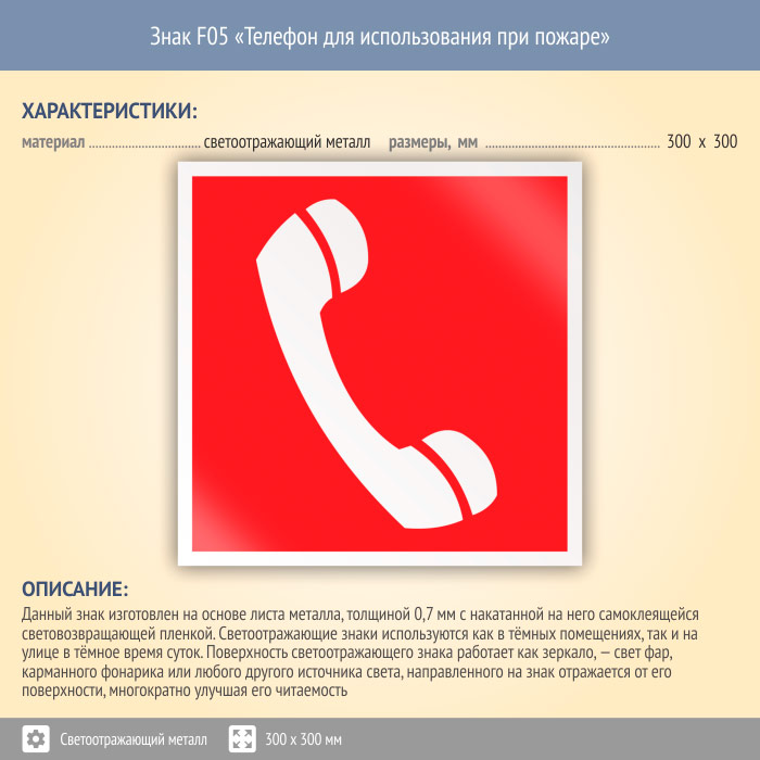 Знак F05 «Телефон для использования при пожаре (в том числе телефон прямой связи с пожарной охраной)» (светоотражающий металл, 300х300 мм) в Черкесске купить