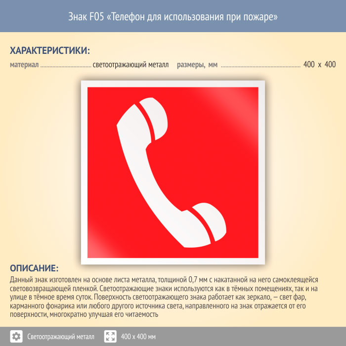 Знак F05 «Телефон для использования при пожаре (в том числе телефон прямой связи с пожарной охраной)» (светоотражающий металл, 400х400 мм) в Черкесске купить