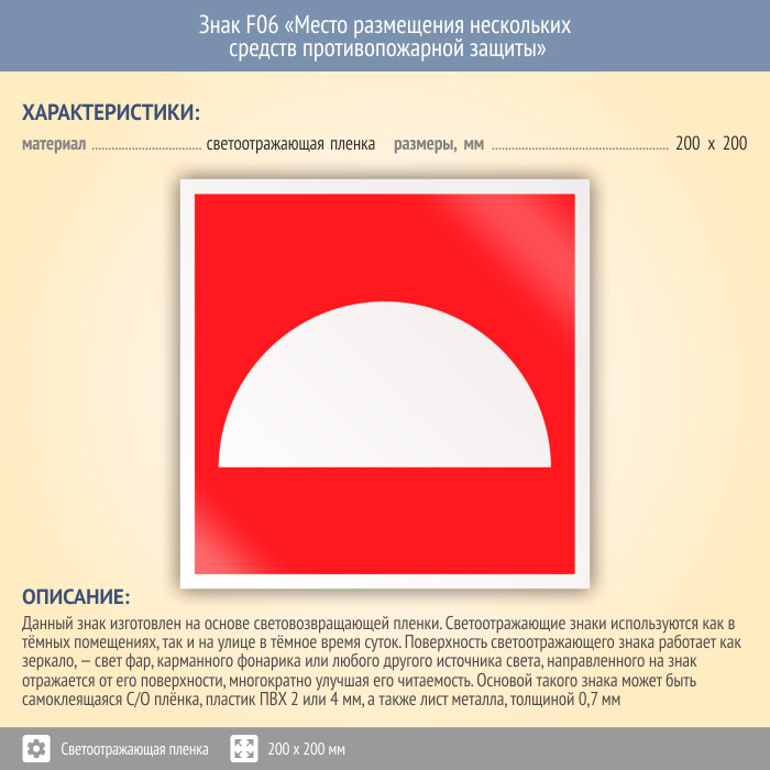Знак F06 «Место размещения нескольких средств противопожарной защиты» (светоотражающая пленка, 200х200 мм) в Черкесске купить