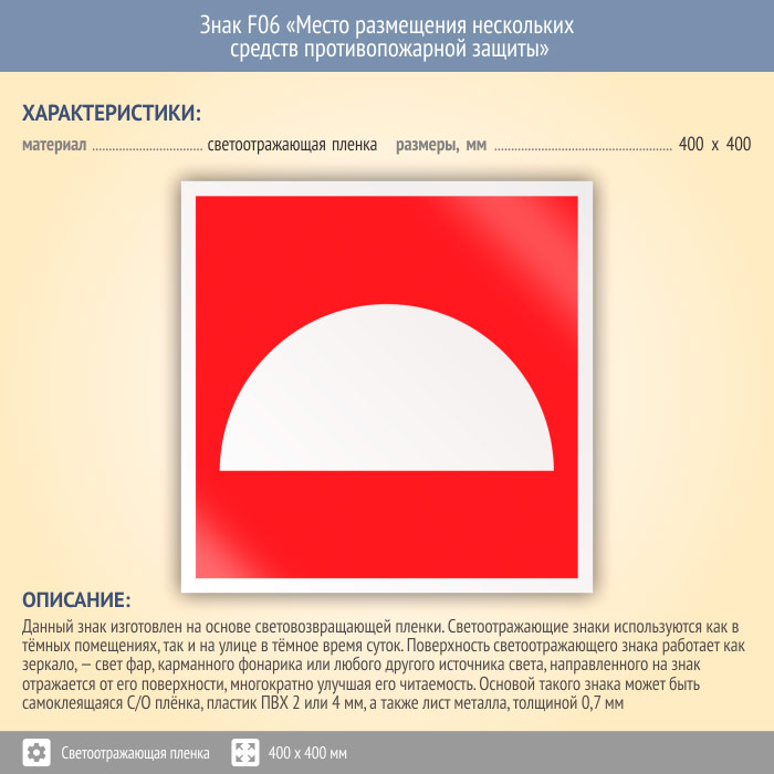 Знак F06 «Место размещения нескольких средств противопожарной защиты» (светоотражающая пленка, 400х400 мм) в Черкесске купить