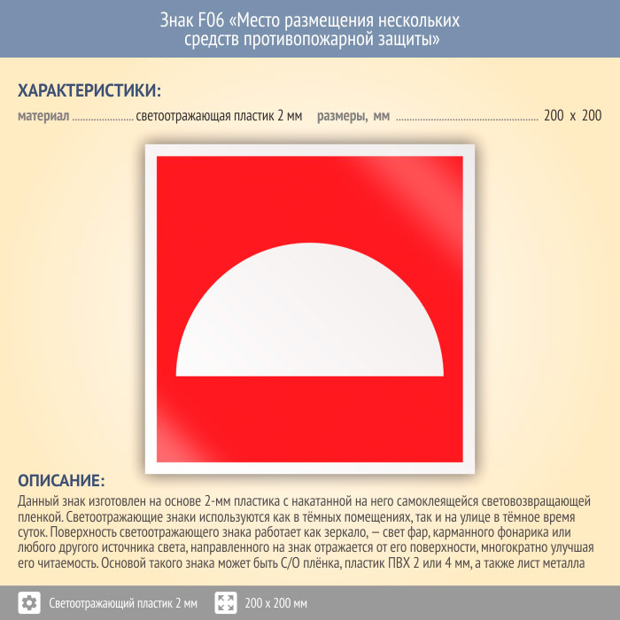Знак F06 «Место размещения нескольких средств противопожарной защиты» (светоотражающий пластик, 200х200 мм) в Черкесске купить