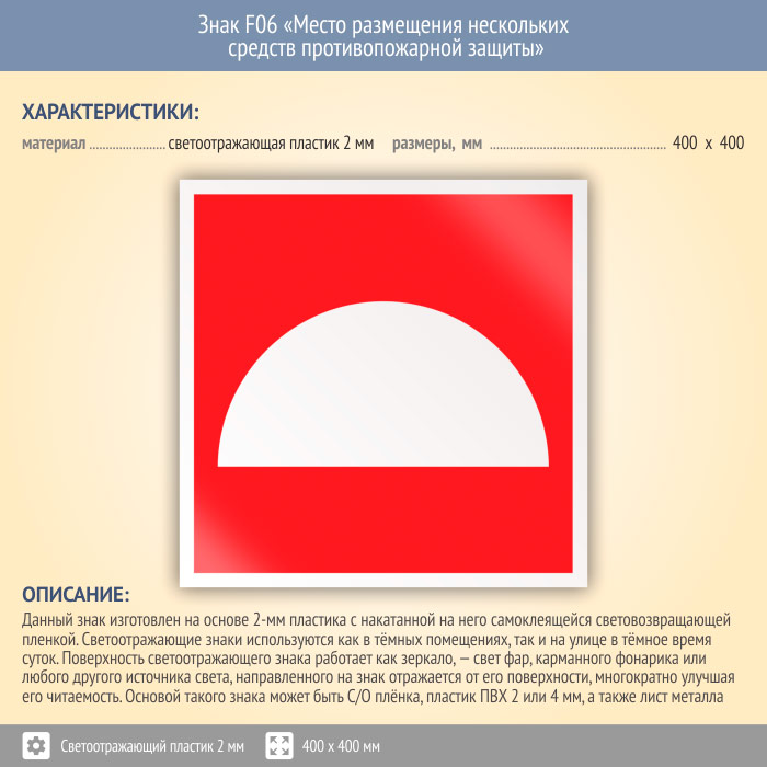 Знак F06 «Место размещения нескольких средств противопожарной защиты» (светоотражающий пластик, 400х400 мм) в Черкесске купить