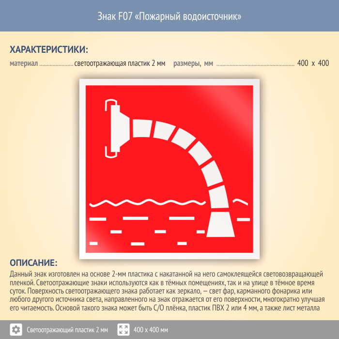 Знак F07 «Пожарный водоисточник» (светоотражающий пластик, 400х400 мм) в Черкесске купить