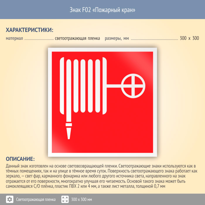 Знак F02 «Пожарный кран» (светоотражающая пленка, 300х300 мм) в Черкесске купить