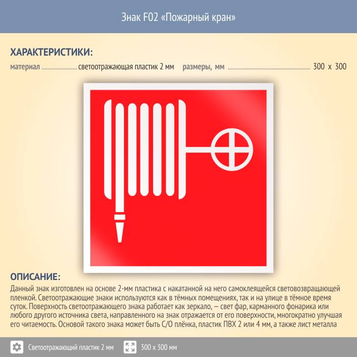 Знак F02 «Пожарный кран» (светоотражающий пластик, 300х300 мм) в Черкесске купить