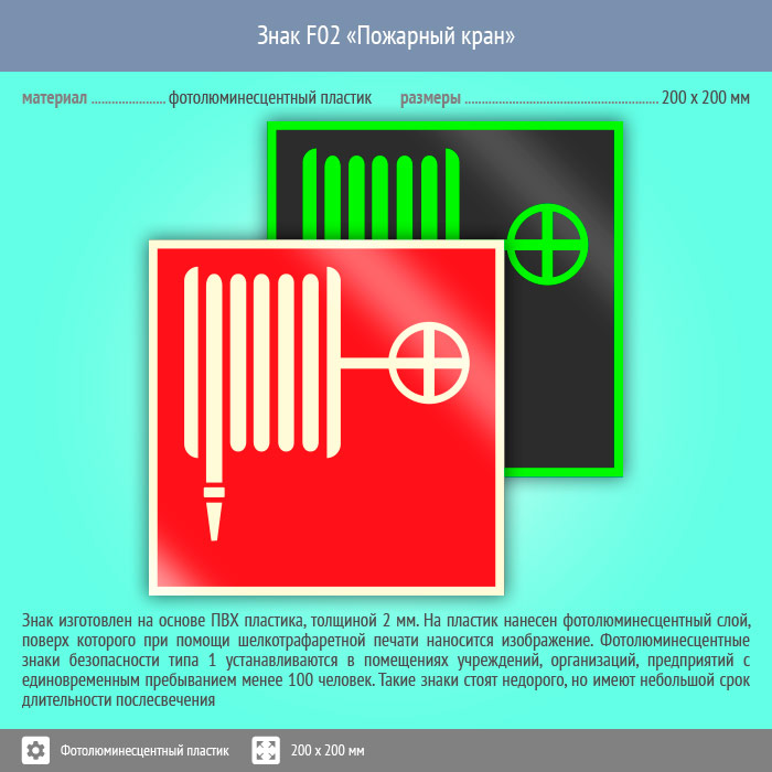 Знак F02 «Пожарный кран» (фотолюминесцентный пластик, 200х200 мм) в Черкесске купить