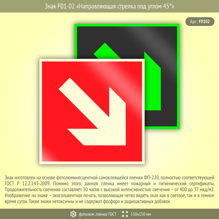 Знак F01-02 «Направляющая стрелка под углом 45°» (фотолюминесцентная пленка ГОСТ 34428-2018, 150х150 мм) в Черкесске купить