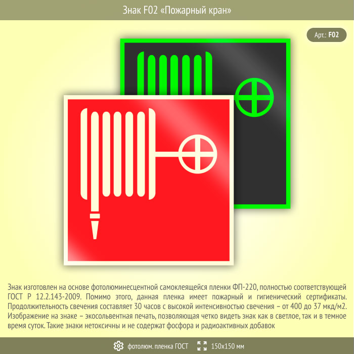 Знак F02 «Пожарный кран» (фотолюминесцентная пленка ГОСТ 34428-2018, 150х150 мм) в Черкесске купить