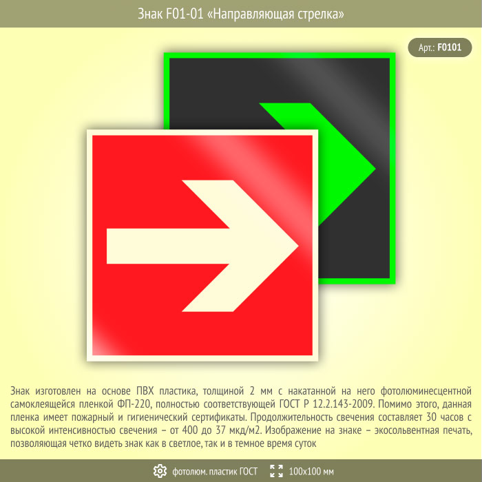 Знак F01-01 «Направляющая стрелка» (фотолюминесцентный пластик ГОСТ 34428-2018, 100х100 мм) в Черкесске купить