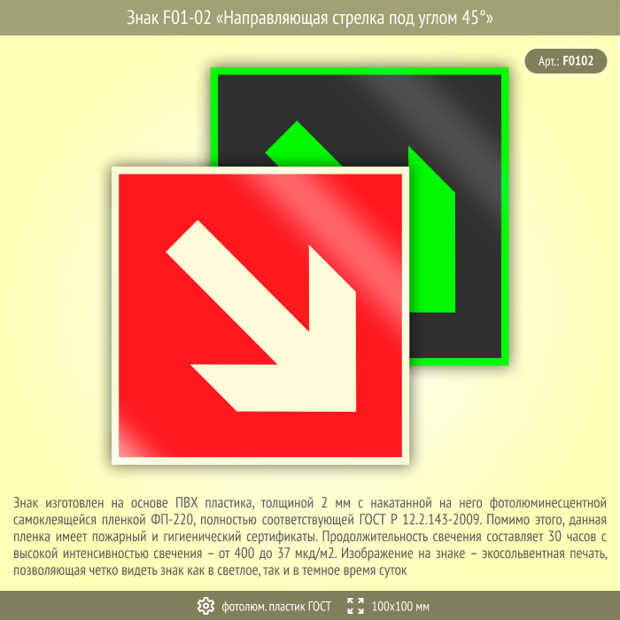 Знак F01-02 «Направляющая стрелка под углом 45°» (фотолюминесцентный пластик ГОСТ 34428-2018, 100х100 мм) в Черкесске купить