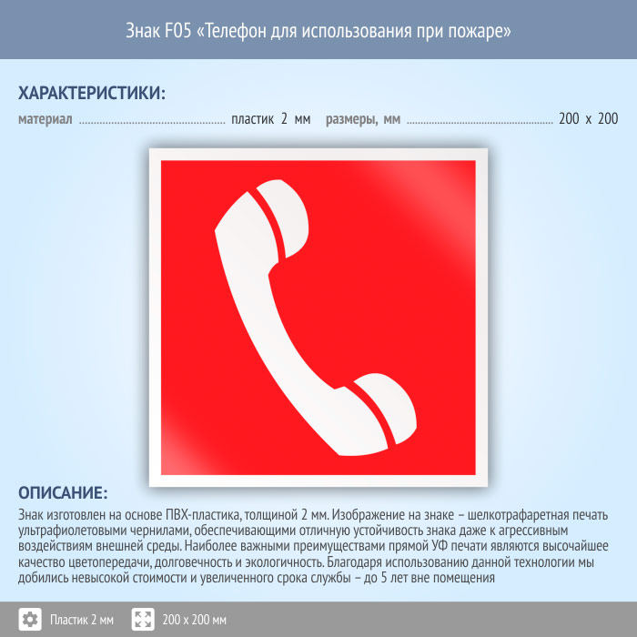 Знак F05 «Телефон для использования при пожаре (в том числе телефон прямой связи с пожарной охраной)» (пластик, 200х200 мм) в Черкесске купить