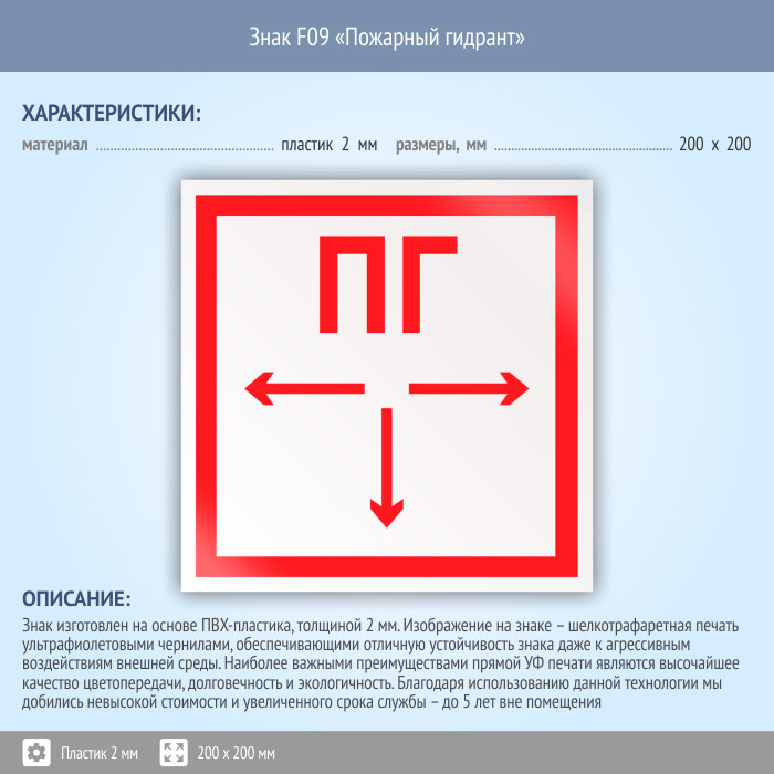 Знак F09 «Пожарный гидрант» (пластик, 200х200 мм) в Черкесске купить