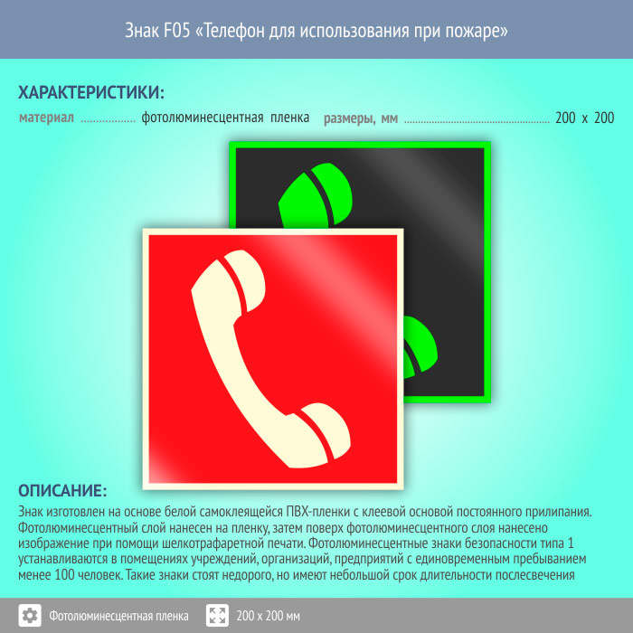 Знак F05 «Телефон для использования при пожаре (в том числе телефон прямой связи с пожарной охраной)» (фотолюминесцентная пленка, 200х200 мм) в Черкесске купить