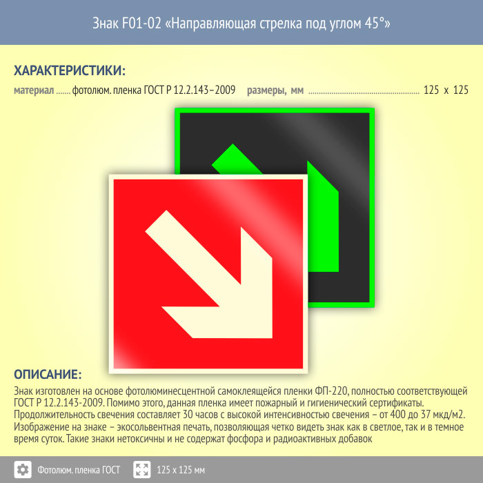 Знак F01-02 «Направляющая стрелка под углом 45°» (фотолюминесцентная пленка ГОСТ 34428-2018, 125х125 мм) в Черкесске купить
