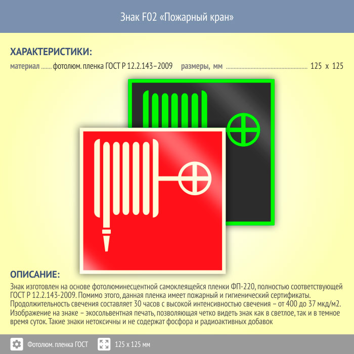 Знак F02 «Пожарный кран» (фотолюминесцентная пленка ГОСТ 34428-2018, 125х125 мм) в Черкесске купить