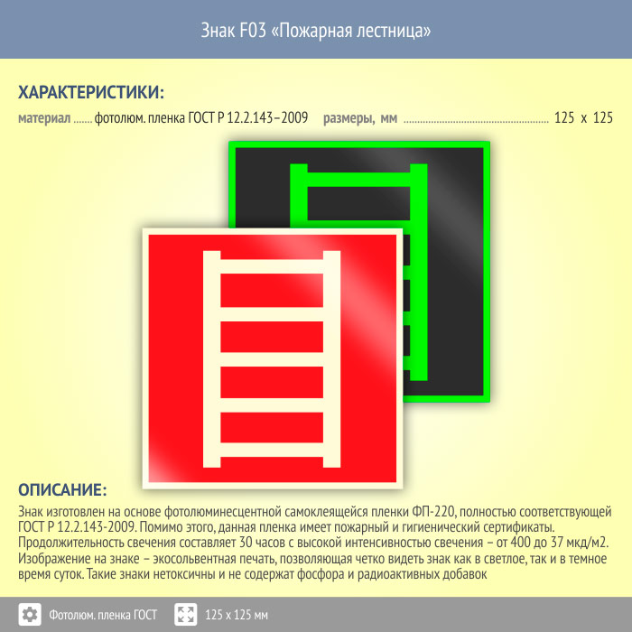 Знак F03 «Пожарная лестница» (фотолюминесцентная пленка ГОСТ 34428-2018, 125х125 мм) в Черкесске купить