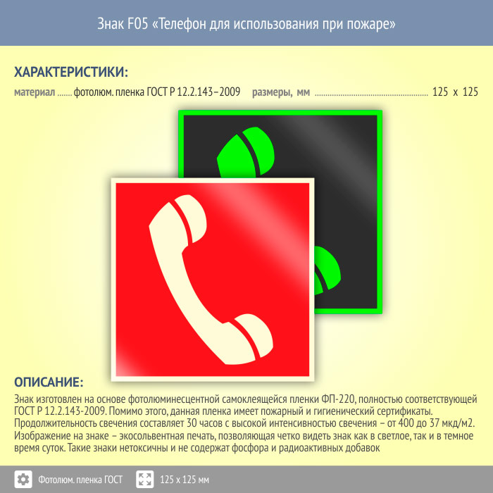 Знак F05 «Телефон для использования при пожаре (в том числе телефон прямой связи с пожарной охраной)» (фотолюминесцентная пленка ГОСТ 34428-2018, 125х125 мм) в Черкесске купить