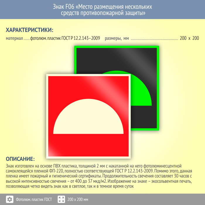 Знак F06 «Место размещения нескольких средств противопожарной защиты» (фотолюминесцентный пластик ГОСТ 34428-2018, 200х200 мм) в Черкесске купить