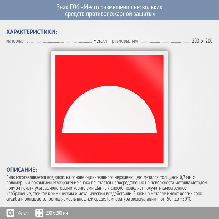 Знак F06 «Место размещения нескольких средств противопожарной защиты» (металл, 200х200 мм) в Черкесске купить