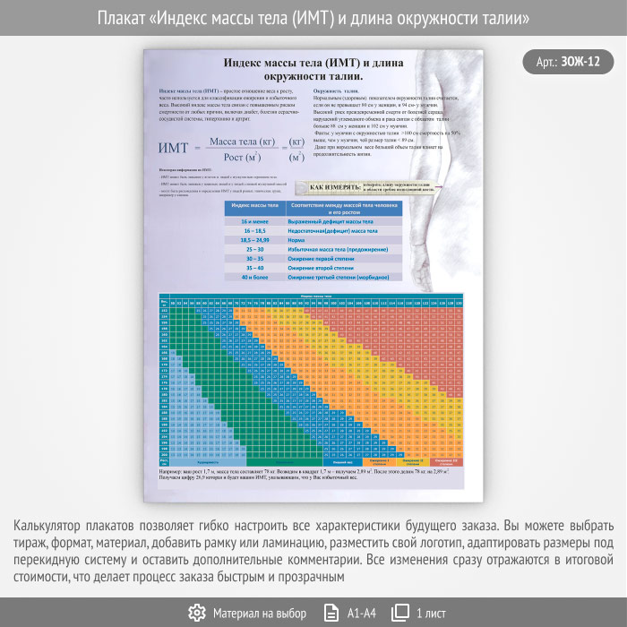 Плакат «Индекс массы тела (ИМТ) и длина окружности талии» (ЗОЖ-12, 1 лист) в Черкесске купить